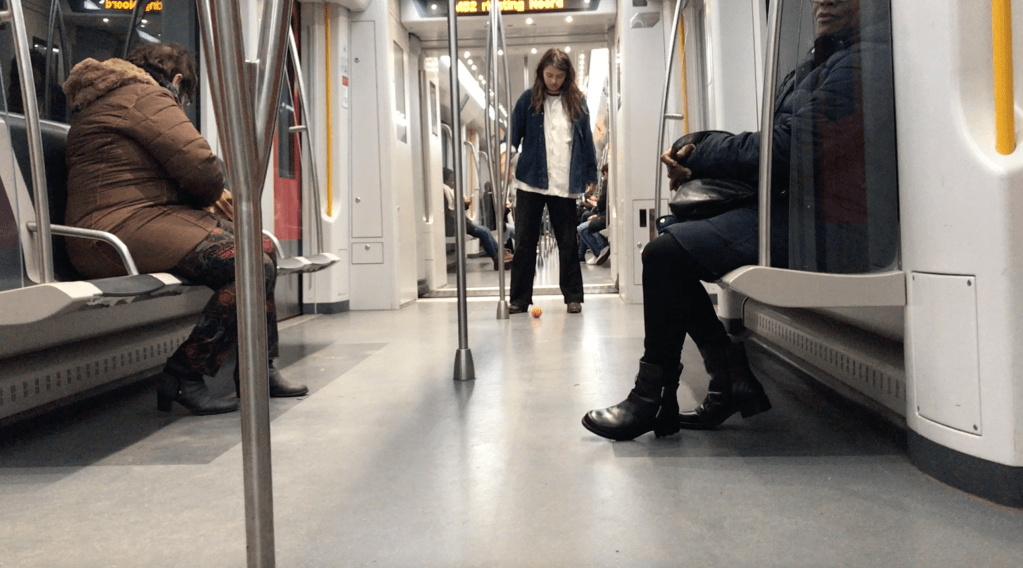 I placed an orange tennisball on the floor of the metro. Then I followed the ball, the movement was caused by the moving of the metro.